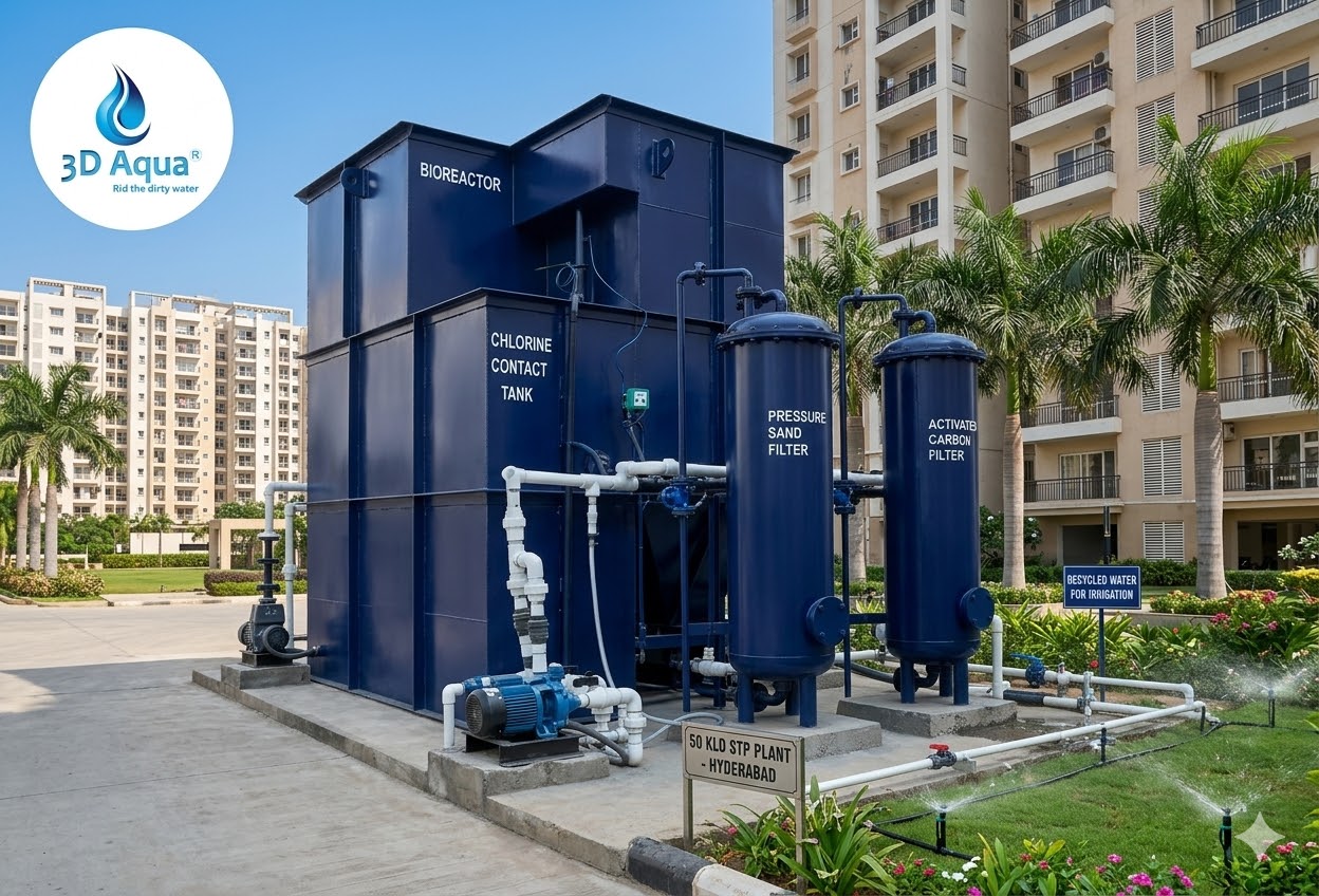 A 50 KLD STP plant is designed to treat approximately 50,000 liters of sewage per day, making it an ideal capacity for medium-sized apartment complexes. Treated water can be safely reused for gardening, flushing, and cleaning, helping reduce freshwater consumption. 3D Aqua Water Treatment Company provides reliable, efficient, and cost-effective STP solutions for residential projects in Hyderabad and across India, ensuring compliance with environmental norms while promoting sustainable water management.